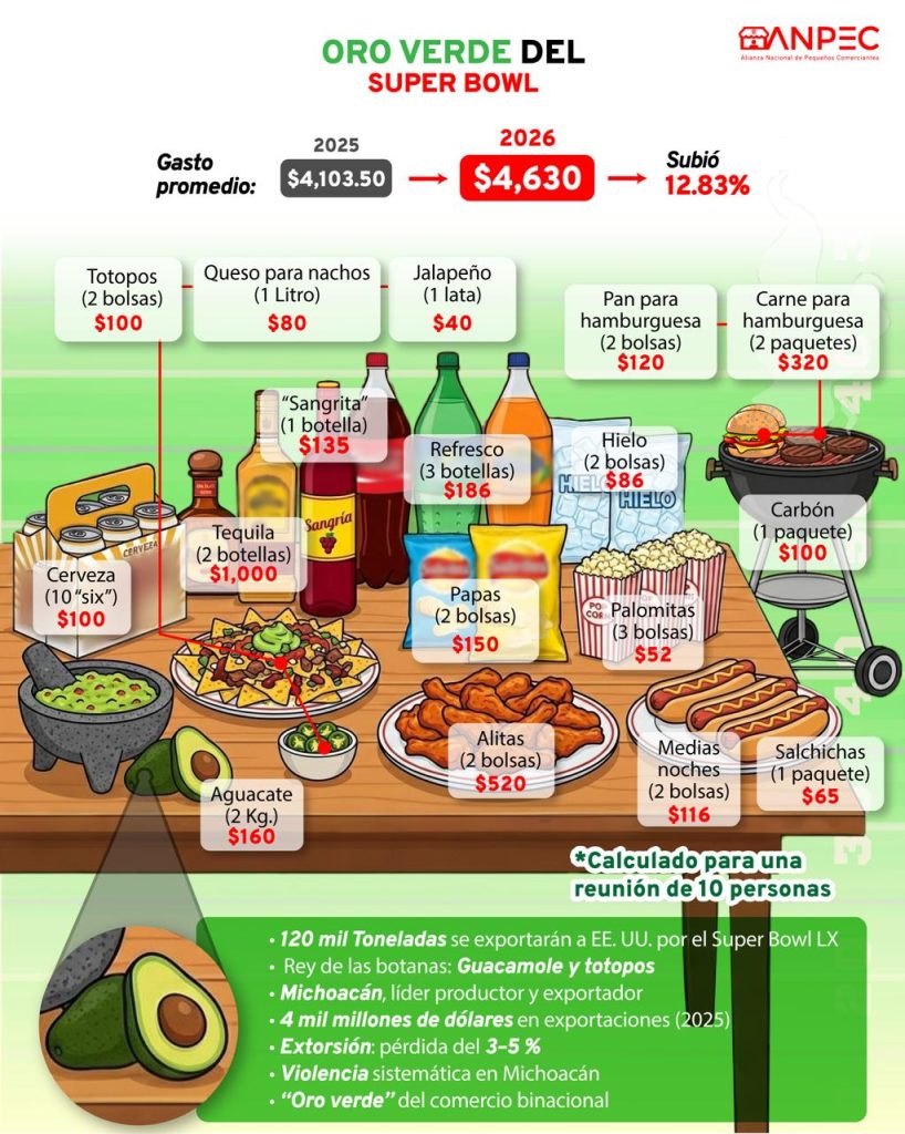 La ANPEC confirmó que se enviaron 120 mil toneladas a Estados Unidos con motivo del Super Bowl LX entre los New England Patriots vs Seattle Seahawks. Michoacán, con todo y el problema de las extorsiones, se concierte en el líder producto y exportador de está edición.