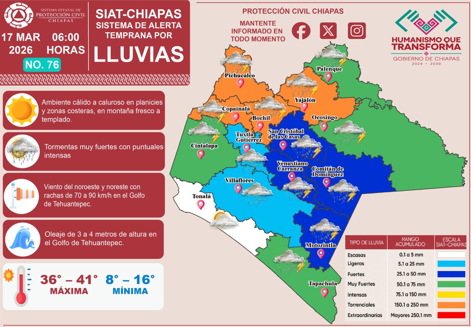 ¡Alerta meteorológica en Chiapas! Este 17 de marzo, el SIAT de Protección Civil advierte por lluvias torrenciales de hasta 150 mm en las regiones Norte, Mezcalapa, De los Bosques y Tulijá. Se esperan también lluvias muy fuertes en el Soconusco y la Selva. Ante el riesgo de inundaciones y deslaves, mantente informado y toma precauciones si transitas por zonas bajas o de montaña.